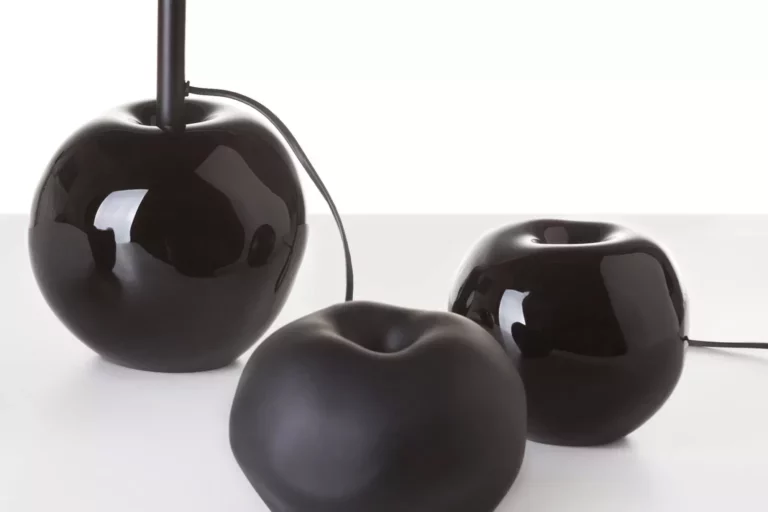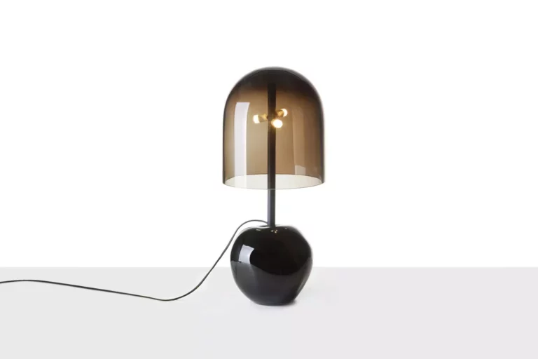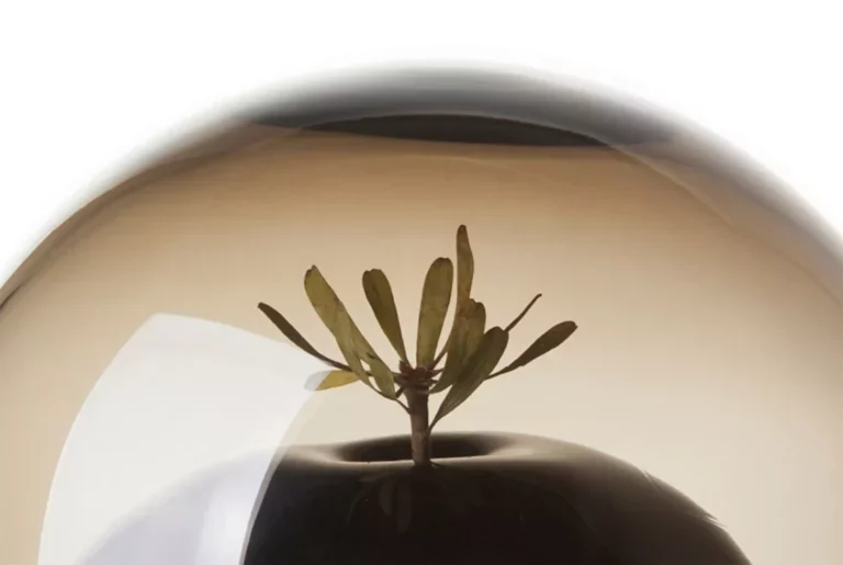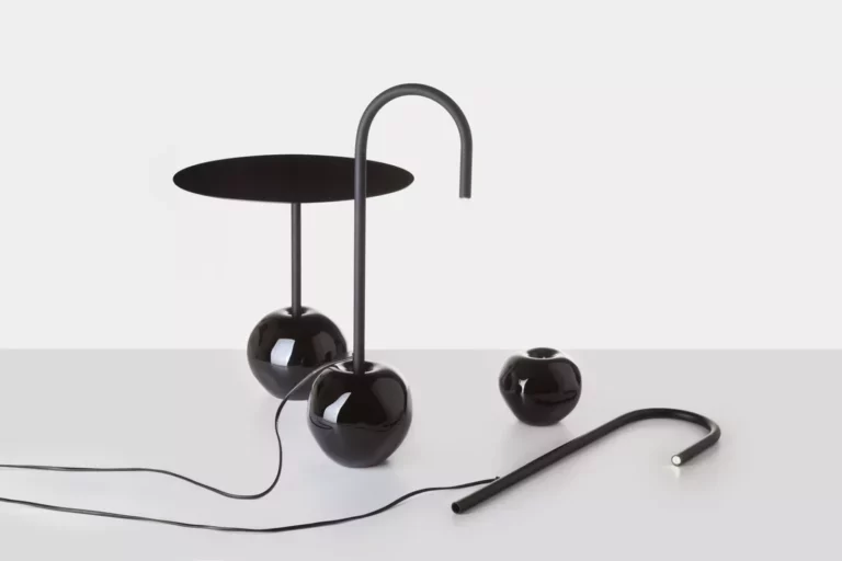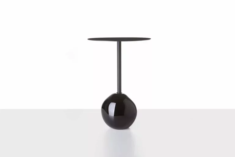 In the floor lamp, the massive, heavy and irregular black volume of the lamp’s base contrasts with a transparent glass dome of the shade, creating an almost floating effect. The vase follows the same concept: a bold, molten black form enclosed by an elegant, translucent dome, creating a piece that is unexpected and original. The table completes the collection, pairing a sculpted black glass base with a sleek, black-coated metal leg and tabletop.