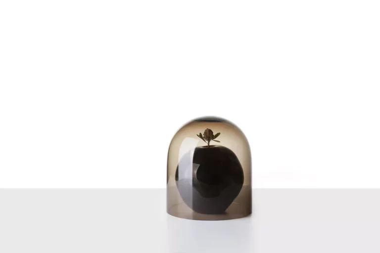 Lightness and heaviness, transparency and darkness. The Antimatter Collection is based on contrasts of form and matter. Each piece juxtaposes a dense, irregular mass of deep black glass with a delicate counterpart from transparent glass or with a minimalist metal construction.