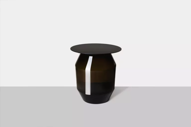 A simple silhouette characterizes the Augarten Table, another elegant combination of a smoke grey glass base and black matte metal sheet tabletop. This small furniture piece, inspired by raw industrial forms, represents precise glass craftsmanship and turns it into a practical object.