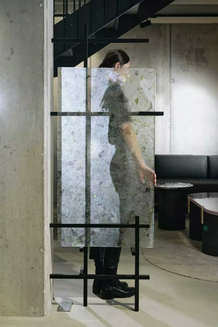 Although by its functional nature it should obstruct the view, the Hidden Gerrit screen naturally attracts the eye thanks to its sculptural form. It combines Gerrit Rietveld’s aesthetics and the use of Fragmentglass. The strict rectangular geometry of the structure creates a certain tension and contrast to the glass plate with its vivid texture of fused shards.