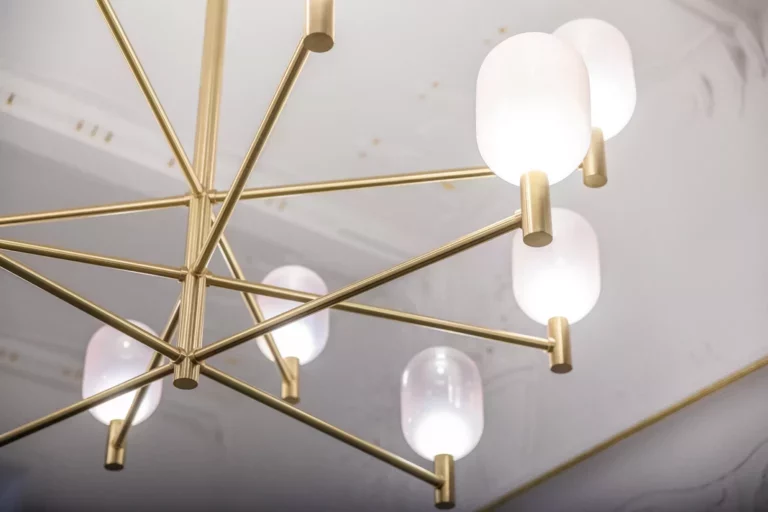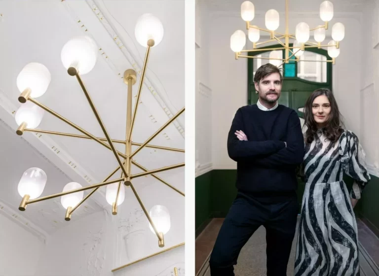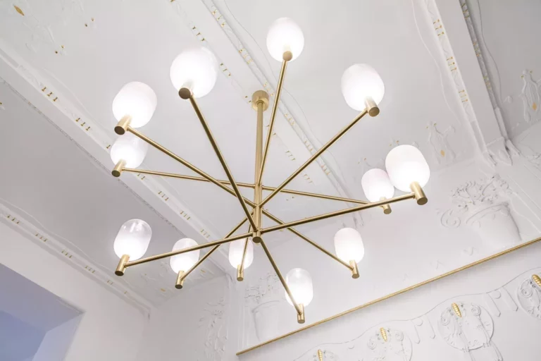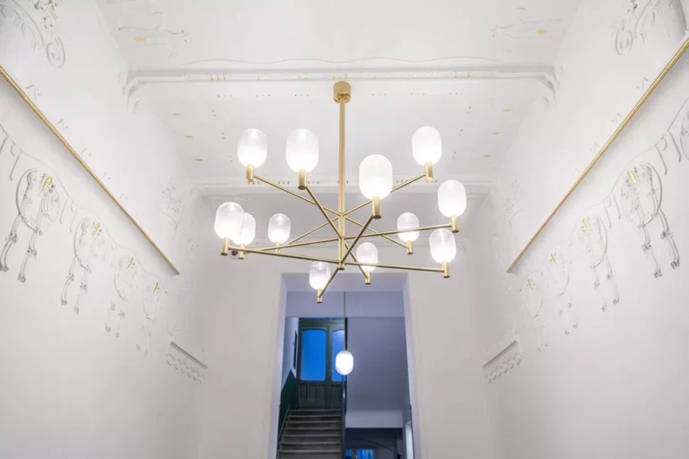The impressive chandelier in the entrance hall consists of a 4-armed brass construction and 12 hand-blown glass capsules of fading pink colour. The light fixtures in other common spaces of the building are variations of this design: A simple glass pendant ceiling lights in an oval shape with a decent colour gradient in glass and a two-armed luminaire with a sophisticated brass detail in the connection of the glass based on the Art Nouveau aesthetics.