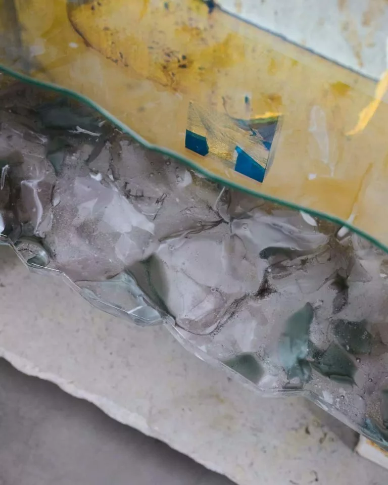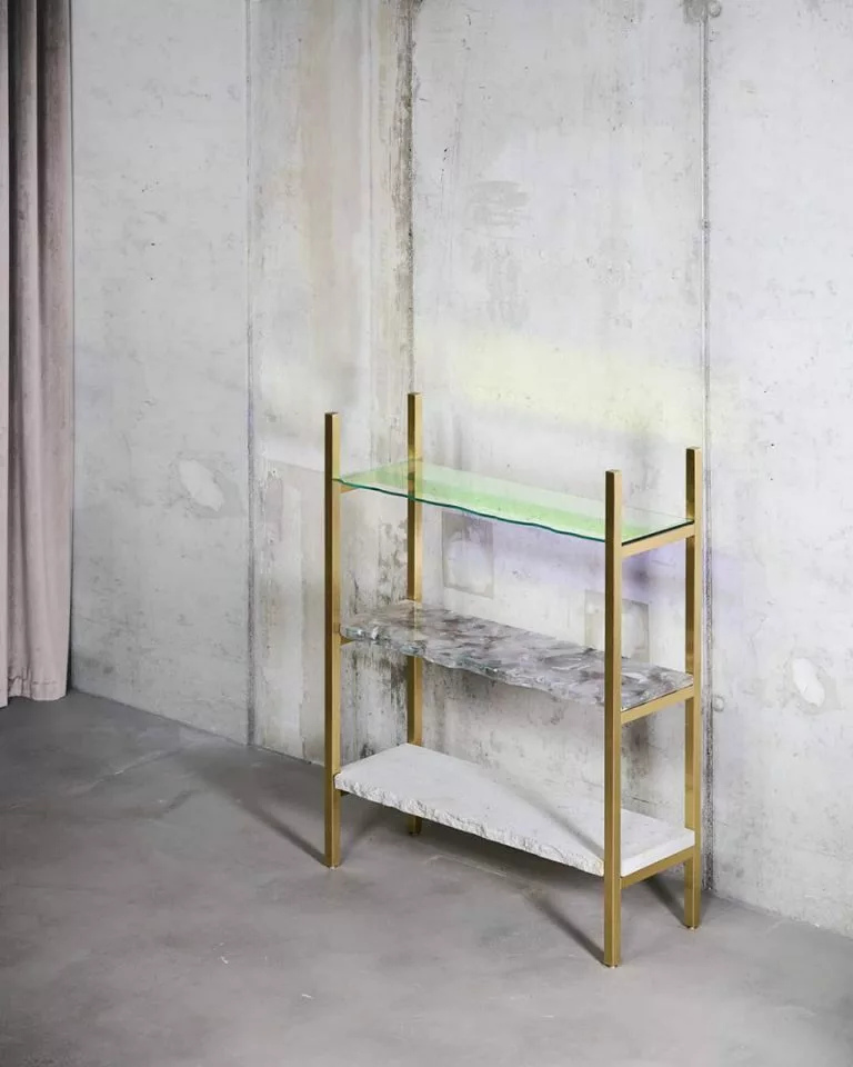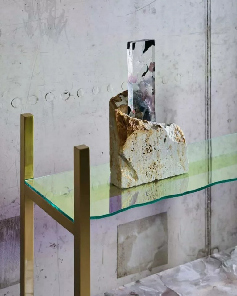 Fragmentglass, dichroic glass, sandstone, brushed brass