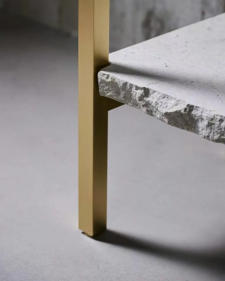 The Sedimenta Shelf is a collage-like composition of earthy solidity and airy elegance, crafted from brushed brass and three distinctive shelves made from sandstone, Fragmentglass, and dichroic glass. Each shelf layer features a unique texture and colour, with a rough, chiselled edge that contrasts with the minimalist construction. Much like the Brass Shelf, it redefines the concept of functionality, transforming a utilitarian piece into an opulent display for cherished mementos and curated objects.